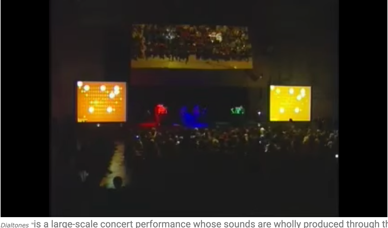 Dialtones “is a large-scale concert performance whose sounds are wholly produced through the carefully choreographed ringing of the audience’s own mobile phones. Before the concert, participants register their mobile phone numbers at a series of web terminals; in exchange, new ringtone melodies are automatically transmitted to their phones, and their seating assignment tickets are generated. During the concert, the audience’s phones are dialed up by live performers, using custom software which permits as many as 60 phones to ring simultaneously. Because the exact location and tone of each participant’s mobile phone is known in advance, the Dialtones concert is able to present a diverse range of unprecedented sonic phenomena and musically interesting structures, such as waves of polyphony which cascade across the audience. Dialtones was presented at the Ars Electronica Festival in September 2001, and at the Swiss National Exposition in May and June of 2002.” [1]
