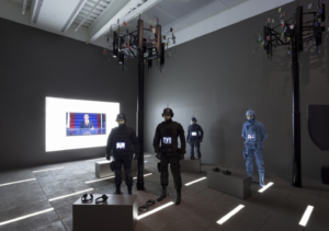 Kline later went on to present this exhibit in the United Kingdom alongside his other project called “Freedom.” (4) He organized these two exhibits to complement each other because of their similarity in showing a “dystopian future”where people are under constant surveillance and technology is at the forefront of humanity. (5) There are electrical poles for cell phones with credit cards attached to them to represent the debt in America associated with technology that keeps us under surveillance. (6) The suspended animation of Barack Obama was playing in the background of four Teletubbies dressed up like a SWAT team.(7)They are standing spread out in the room and the Teletubbies are meant to be a commentary on “Occupy Wall street Protest Camp in 2011.”(8) On their stomachs they have videos of “former police officers” reading off scripts by “political activists” speaking about “social media.”(9
