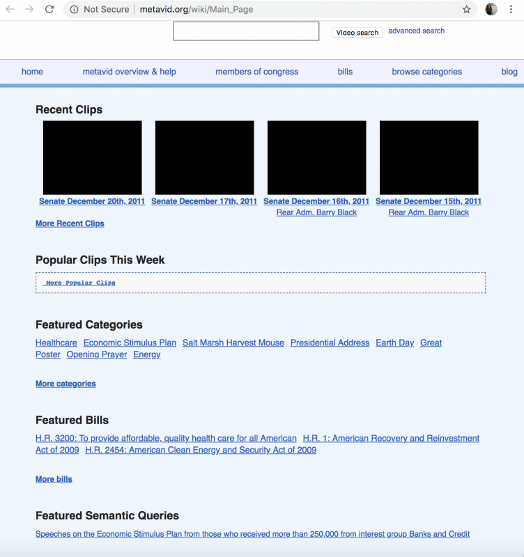 Currently, Metavid hosts the “largest free and reusable archive of house and senate legislative footage”[1] which is made available through a partnership with archive.org. The online platform was launched in early 2006 under the advisement of University of California Santa Cruz’s Professor Warren Sack for Michael Dale and Abram Stern’s Digital Arts and New Media MFA thesis project. Metavid sparked interest in the United States House and Senate, and in 2010 the House launched their own online media content source following the Senate’s launch in 2011.