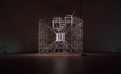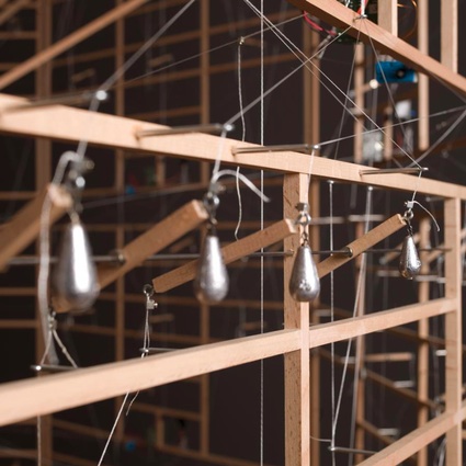 Constructed from sticks, strings and small plumb-bobs, Rechnender Raum resembles a large cage from afar. As an observer, one has the impression that it hosts a living being, as the ever-turning mechanisms of the kinetic sculpture emit insect-like hums and buzzes. As the functions of the mechanism are kept on the outside of the sculpture, one can easily follow them, yet the results of the computations enter the centre of the structure and are hidden from the observer. “So an interesting paradox appears: while the machine opens up everything it closes it at the same time, as if it has a secret.” [2] Baecker’s sculpture’s is extremely captivating through its intricate endlessness, transparency, fragility and power.