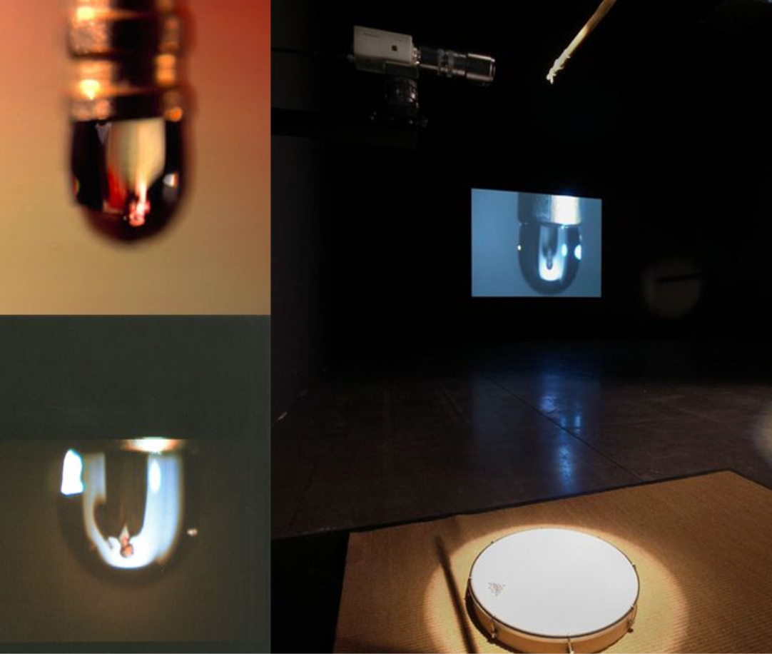 «En un espacio grande y oscurecido, una tubería de cobre sale del techo, terminando en una pequeña válvula de la que emerge lentamente una sola gota de agua. Una cámara de vídeo a color, equipada con una lente especial y un accesorio de fuelle utilizado para el aumento de primer plano extremo, se centra en esta gota. La cámara está conectada a un proyector de vídeo que muestra la gota hinchable de agua en una pantalla grande en la parte posterior del espacio. Las propiedades ópticas de la gota de agua hacen que actúe como una lente ojo de pez, revelando una imagen de la habitación y los que están dentro de ella. La gota crece en tamaño gradualmente, hinchazón en la tensión superficial, hasta que llena la pantalla. De repente se cae de la imagen y se escucha un fuerte «boom» resonante mientras aterriza en un tambor amplificado. Luego, en un ciclo interminable de repetición, una nueva gota comienza a emerger y vuelve a llenar la pantalla». [1]
